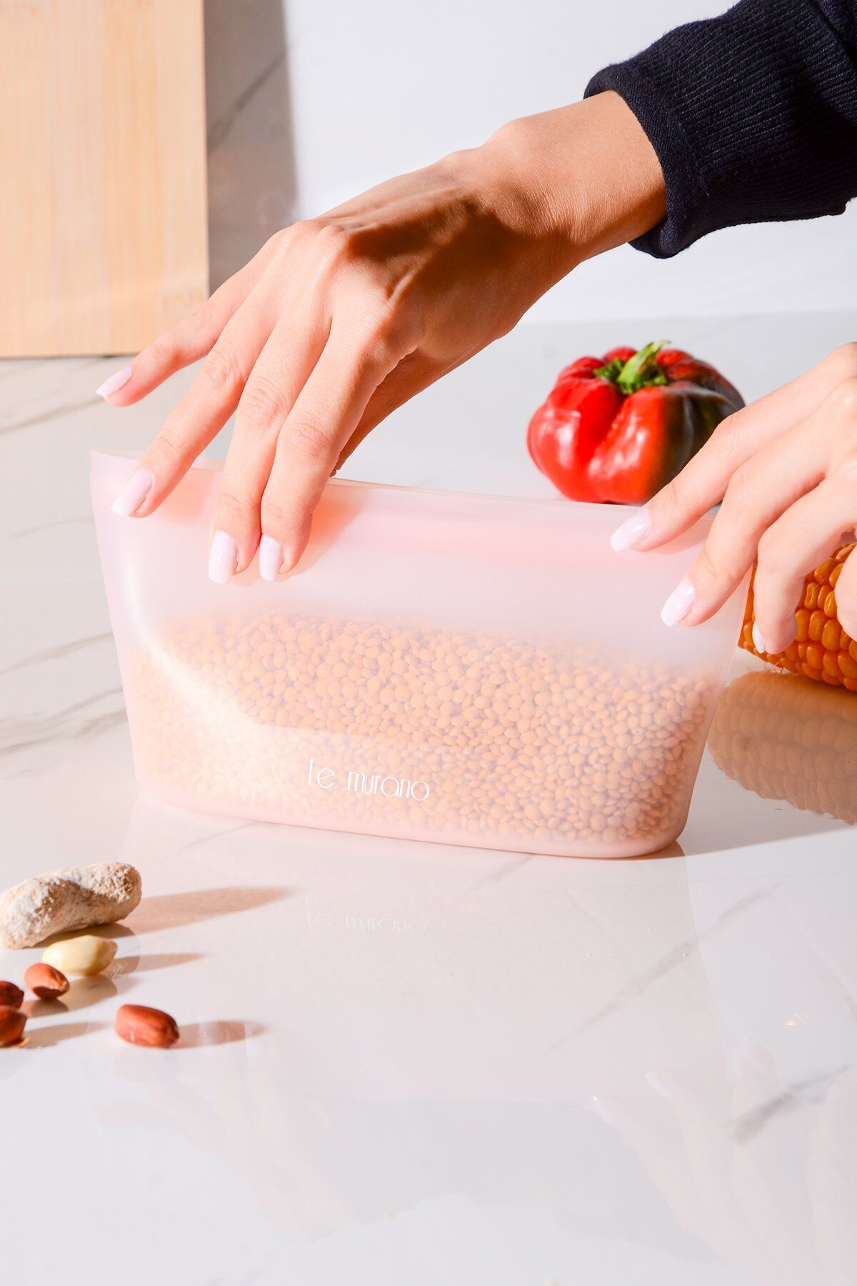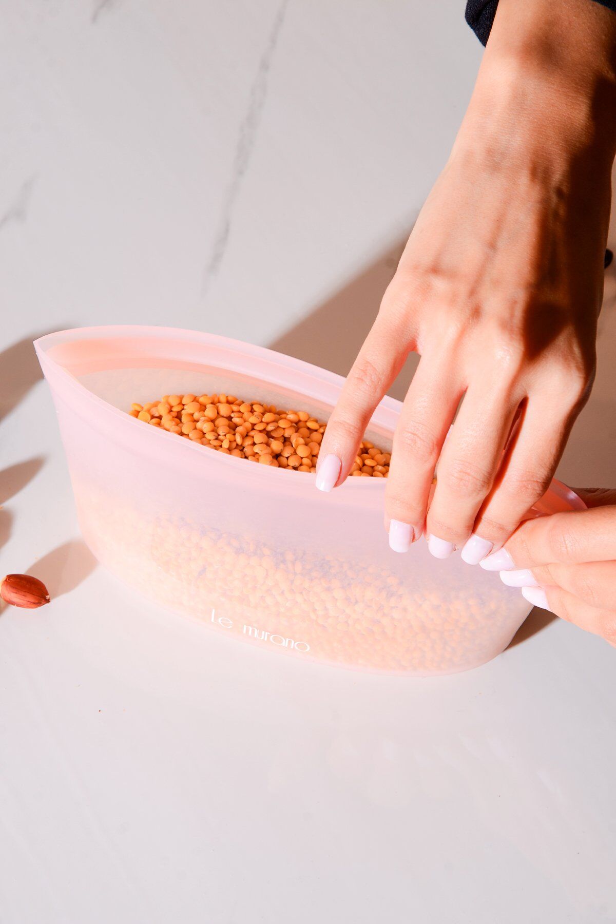 Mood Hava Sızdırmaz Kilitli Silikon Saklama Torbası 450 ml; hava sızdırmaz kilitli ağzı sayesinde sızıntıyı önler. Dik durabilen geniş taban, dolap ve buzdolabında düzen sağlar. Atıştırmalık, sebze‑meyve, sous‑vide/marine ve seyahat eşyaları için uygundur. Dondurucu ve bulaşık makinesi uyumlu. Kozmetik/kişisel bakım için: ruj, mini parfüm ve seyahat boyu şişeleri düzenli ve sızıntısız taşımak için de uygundur.