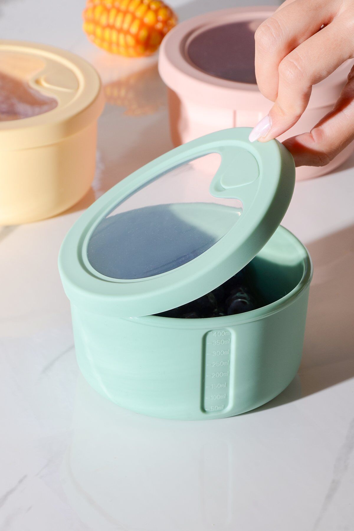 Pastel Yuvarlak Silikon Saklama ve Taşıma Kabı 400 ml: sızdırmaz kapaklı, tekrar kullanılabilir ve kokusuz silikon yapıda. Artan yemek, öğle yemeği, bebek maması ve soslar için ideal. Mikrodalga ve dondurucu uyumlu, bulaşık makinesinde yıkanabilir.