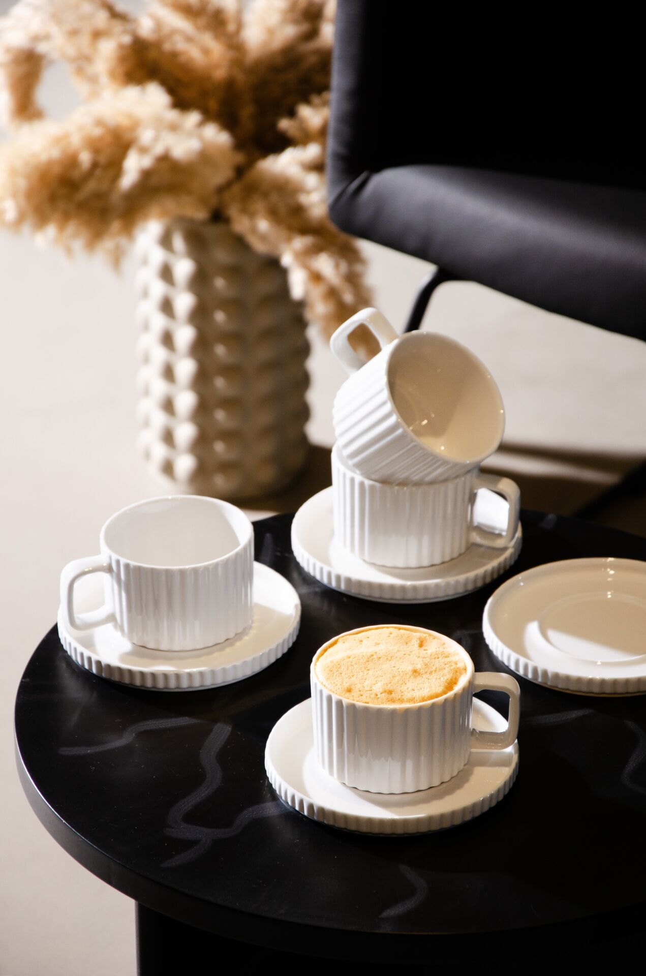 Ritz 4 Kişilik Çay ve Kahve Fincanı Takımı, modern dikey formu ve sade tasarımıyla hem günlük kullanıma hem de özel anlara eşlik edecek bir şıklık sunar. 200 ml hacmiyle çay, kahve ve diğer sıcak içecekler için ideal boyuttadır.