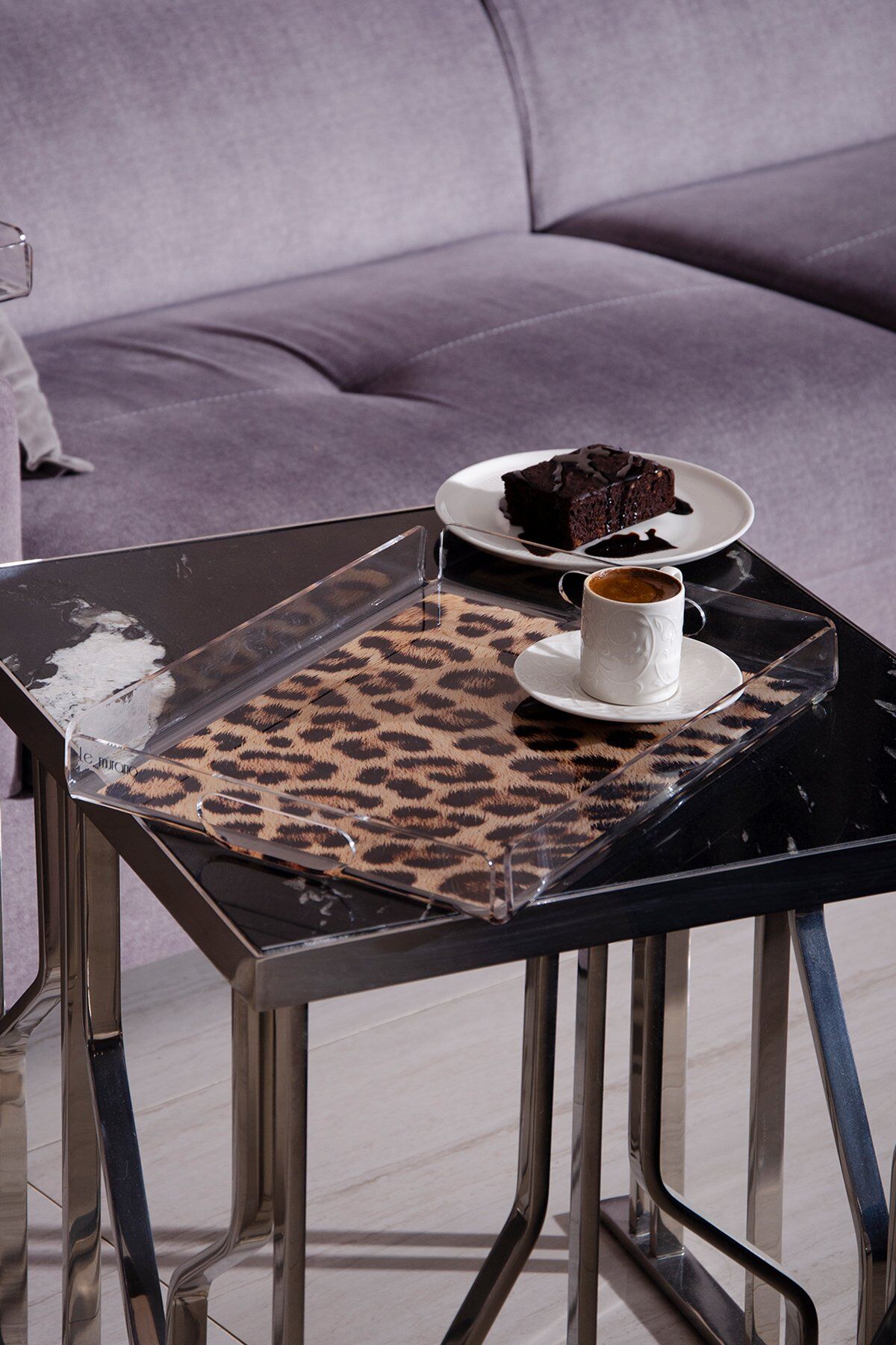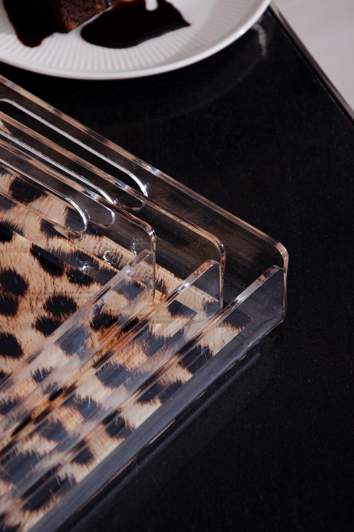 Büyük boy Wild Leopard pleksi tepsi, geniş yüzeyi sayesinde birden fazla sunumu aynı anda şıklıkla taşımanıza olanak tanır. Zarif detayları ve dikkat çekici leopar deseniyle ev dekorasyonunuza dinamizm katar.